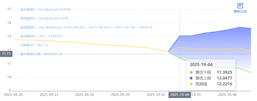 玄田算法是由项目课题组团队原创的非经典逻辑数值聚合理论和不确定性预测方法,构建了基于一致模算子的生猪价格预测模型。该模型采用的聚合函数及一致模相关理论与方法已获得多项国家自然科学基金和省级自然科学资金资助,并获得多项省级自然科学奖奖项。10月04日预测猪价为12.2216,置信区间在11.3925--13.0477之间。10月05日预测猪价为12.0770;10月06日预测猪价为12.1099。