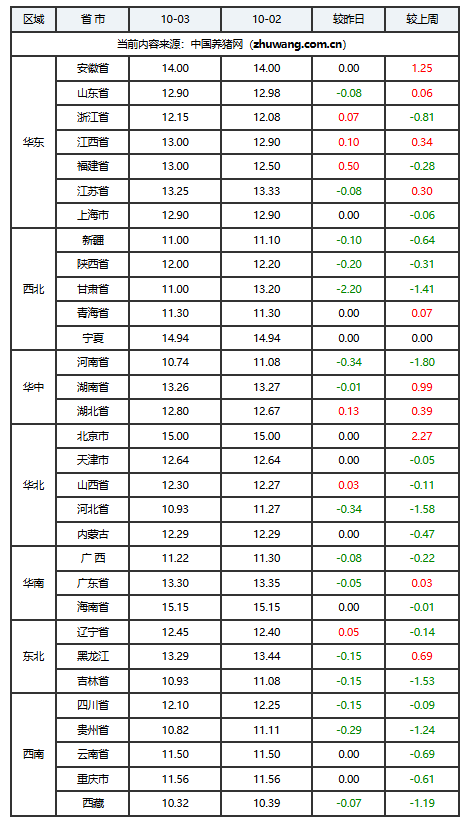 猪价下跌地区(15个):新疆尔自治区、湖南省、广东省、黑龙江省、四川省、江苏省、山东省、陕西省、甘肃省、广西壮族自治区、河南省、河北省、贵州省、西藏自治区、吉林省;下跌区间:0.01-2.20元/公斤;