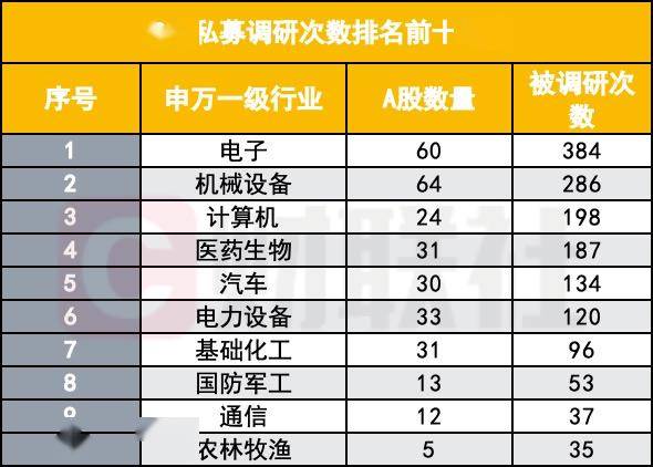 基础化工、国防、通信、农林牧渔等行业同样进入调研次数排名前十的名单之中,其中基础化工行业被调研96次,国防军工被调研53次,通信被调研37次,农林牧渔被调研35次。
