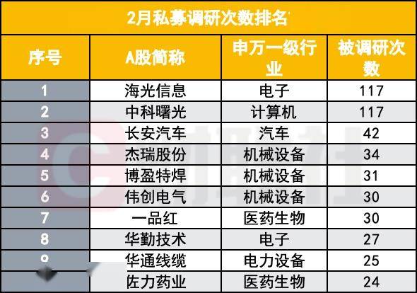 在调研次数排名前十的个股中,机械设备、电子和医药生物行业占据了绝大多数席位。机械设备行业有三家企业入围,分别是、和,被调研次数分别为34次、31次和30次。电子行业除海光信息外,同样进入前十名单,被调研27次。