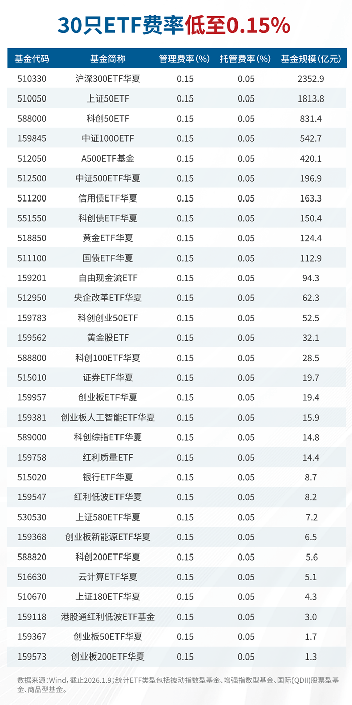 尤其值得一提的是,华夏基金管理费率为0.15%的低费率ETF,涵盖了资本市场的“主动脉”与“大赛道”:从汇聚A股核心资产的沪深300、上证50、中证A500,到代表创新成长的创业板50、科创50,再到人工智能、云计算、黄金、自由现金流等重要的行业、策略、商品领域。
