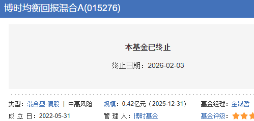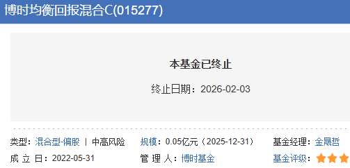 截至2026年2月2日,该基金出现连续五十个工作日基金资产净值低于五千万元的情形,已触发《基金合同》中约定的基金终止条款。根据《基金合同》有关约定,博时基金管理有限公司应依据基金财产清算程序对该基金进行财产清算并终止基金合同,且无需召开基金份额持有人大会。