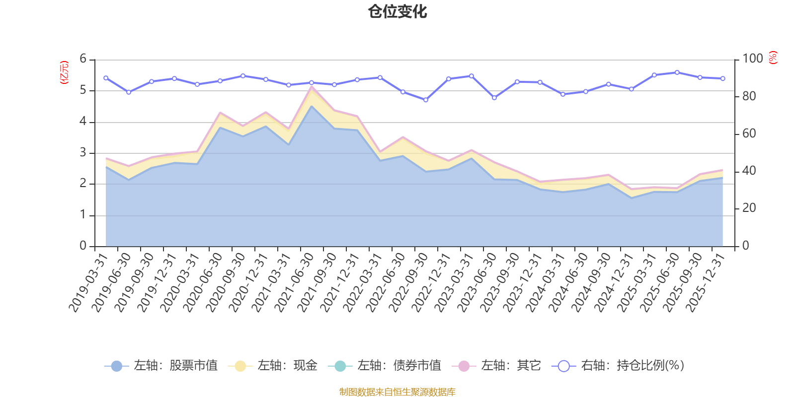 据定期报告数据统计,近三年平均股票仓位为87.26%,同类平均为72.57%。2025年上半年末基金达到93.12%的最高仓位,2022年三季度末最低,为78.42%。