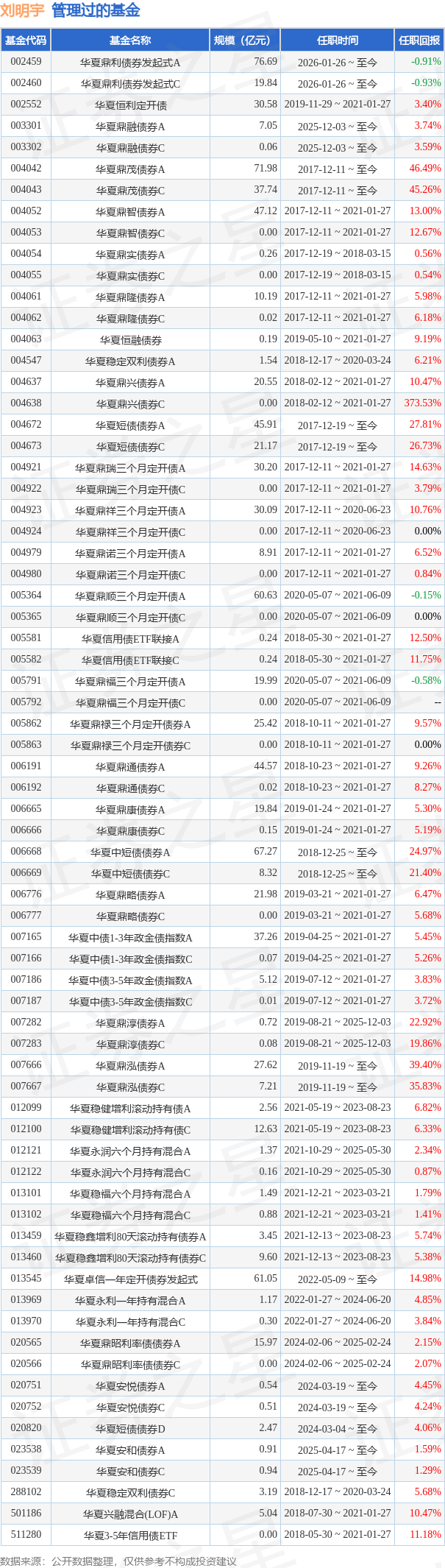 刘明宇先生:经济学硕士。2009年6月加入华夏基金管理有限公司,历任机构债券投资部研究员、投资经理助理、投资经理,华夏鼎实债券型证券投资基金基金经理(2017年12月19日至2018年3月14日期间)、华夏鼎盛债券型证券投资基金基金经理(2017年12月19日至2019年1月7日期间)、华夏稳定双利债券型证券投资基金基金经理(2018年12月17日至2020年3月24日期间)、华夏鼎祥三个月定期开放债券型发起式证券投资基金基金经理(2017年12月11日至2020年6月23日期间)、华夏鼎智债券型证券投资基金基金经理(2017年12月11日至2021年1月27日期间)、华夏鼎隆债券型证券投资基金基金经理(2017年12月11日至2021年1月27日期间)、华夏鼎诺三个月定期开放债券型发起式证券投资基金基金经理(2017年12月11日至2021年1月27日期间)、华夏鼎瑞三个月定期开放债券型发起式证券投资基金基金经理(2017年12月11日至2021年1月27日期间)、华夏鼎兴债券型证券投资基金基金经理(2018年2月12日至2021年1月27日期间)、华夏上证3-5年期中高评级可质押信用债交易型开放式指数证券投资基金基金经理(2018年5月30日至2021年1月27日期间)、华夏上证3-5年期中高评级可质押信用债交易型开放式指数证券投资基金发起式联接基金基金经理(2018年5月30日至2021年1月27日期间)、华夏3年封闭运作战略配售灵活配置混合型证券投资基金(LOF)基金经理(2018年7月30日至2021年1月27日期间)、华夏鼎禄三个月定期开放债券型发起式证券投资基金基金经理(2018年10月11日至2021年1月27日期间)、华夏鼎通债券型证券投资基金基金经理(2018年10月23日至2021年1月27日期间)、华夏鼎康债券型证券投资基金基金经理(2019年1月24日至2021年1月27日期间)、华夏鼎略债券型证券投资基金基金经理(2019年3月21日至2021年1月27日期间)、华夏中债1-3年政策性金融债指数证券投资基金基金经理(2019年4月25日至2021年1月27日期间)、华夏恒融一年定期开放债券型证券投资基金基金经理(2019年5月10日至2021年1月27日期间)、华夏中债3-5年政策性金融债指数证券投资基金基金经理(2019年7月12日至2021年1月27日期间)、华夏恒利3个月定期开放债券型证券投资基金基金经理(2019年11月29日至2021年1月27日期间)、华夏鼎顺三个月定期开放债券型发起式证券投资基金基金经理(2020年5月7日至2021年6月9日期间)、华夏鼎福三个月定期开放债券型发起式证券投资基金基金经理(2020年5月7日至2021年6月9日期间)、华夏稳福六个月持有期混合型证券投资基金基金经理(2021年12月21日至2023年3月21日期间)、华夏稳健增利4个月滚动持有债券型发起式证券投资基金基金经理(2021年5月19日至2023年8月23日期间)、华夏鼎昭利率债债券型证券投资基金基金经理(2024年2月6日至2025年2月24日)、华夏稳鑫增利80天滚动持有债券型证券投资基金基金经理(2021年12月13日至2023年8月23日期间)等。现任华夏基金管理有限公司总经理助理,公募固定收益投资总监、投委会成员,华夏鼎茂债券型证券投资基金基金经理(2017年12月11日起任职)、华夏中短债债券型证券投资基金基金经理(2018年12月25日起任职)、华夏短债债券型证券投资基金基金经理(2019年1月8日起任职)、华夏鼎淳债券型证券投资基金基金经理(2019年8月21日起至2025年12月3日任职)、华夏鼎泓债券型证券投资基金基金经理(2019年11月19日起任职)、华夏永润六个月持有期混合型证券投资基金基金经理(2021年10月29日至2025年5月30日期间)、华夏永利一年持有期混合型证券投资基金基金经理(2022年1月27日至2024年6月20日任职)、华夏卓信一年定期开放债券型发起式证券投资基金基金经理(2022年5月9日起任职)、华夏安悦债券型证券投资基金基金经理(2024年3月19日起任职)。2025年12月3日起任华夏鼎融债券型证券投资基金基金经理。2026年1月26日任华夏鼎利债券型发起式证券投资基金基金经理。