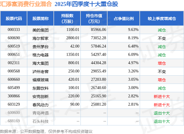根据2025基金年报公募基金重仓股数据,重仓该股的公募基金共31家,其中持有数量最多的公募基金为汇添富基金的汇添富消费行业混合。汇添富消费行业混合目前规模为89.23亿元,最新净值4.675(4月15日),较上一交易日上涨0.6%,近一年下跌2.97%。该公募基金现任基金经理为胡昕炜。胡昕炜在任的基金产品包括:汇添富价值创造定开混合,管理时间为2018年1月19日至今,期间收益率为86.22%;汇添富消费升级混合A,管理时间为2018年12月21日至今,期间收益率为79.1%;汇添富民安增益定开混合A,管理时间为2019年9月17日至今,期间收益率为51.06%。