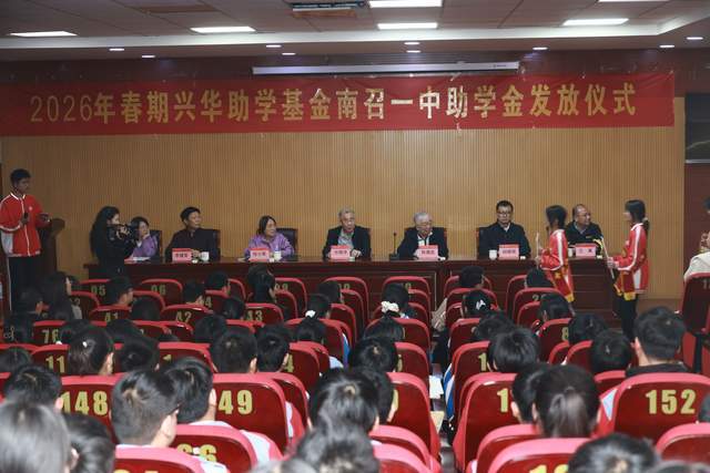 4月2日晚,2026年春期甘肃兴华青少年助学基金会助学金发放仪式在南召一中隆重举行,陈章武书记、钱小军理事长,县委书记方明洋,副县长胡晓琛,心理专家潘新凌,清华大学河南校友会副会长李建军等出席活动,为100名困难学子每人发放助学金。